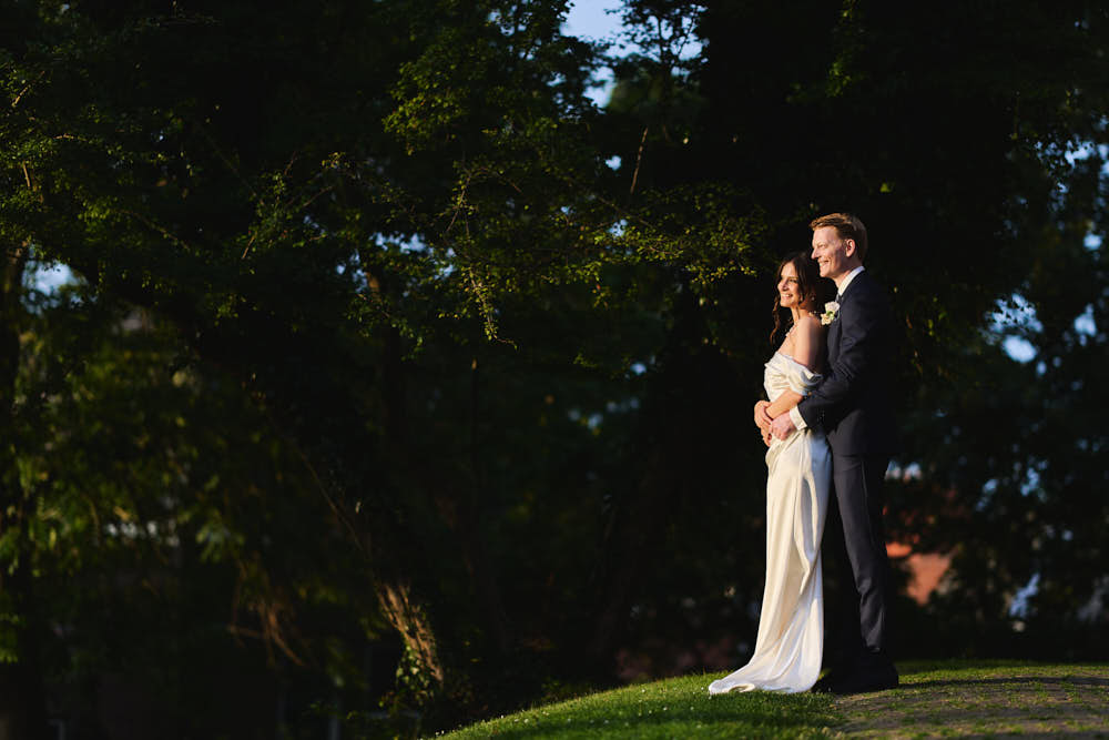 We rijden richting Leiden om in het centrum van de stad een serie toffe trouwfoto's vast te leggen. Leiden is ideaal voor mooie bruidsportretten, helemaal met dit prachtige weer. De Hooglandse kerk doet het natuurlijk altijd goed, maar ook de binnenstad met de kanaaltjes, bruggetjes, de Burcht van Leiden en natuurlijk Molen de Put zijn ideaal voor het vastleggen van de liefde. Het is best druk in de stad, maar we weten de rustige plekjes makkelijk te vinden. Toch is het ook wel leuk voor het bruidspaar om alle felicitaties van wildvreemden in ontvangst te nemen.